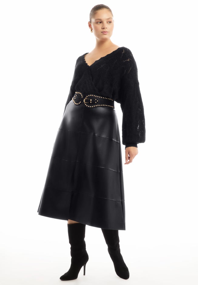 The deep-V neckline & scalloped trim at the neckline elevate this wrap sweater. Its dropped shoulders and relaxed fit make it effortless yet undeniably romantic. Women's plus-size wrap sweater.