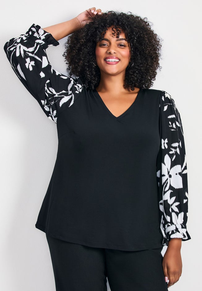 Meet your new wardrobe sensation—the Scarlet Mix Media Top! Crafted with a luxurious stretch ITY jersey body and eye-catching printed georgette sleeves, this top effortlessly transitions from the boardroom to a chic dinner date. Get ready to turn heads and redefine elegance!