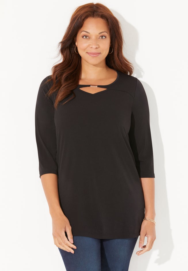 FIT: Relaxed, feminine and easy with an open oval at the scoop neckline, accented with an ornament. Center back seam. Swing shape in a longer, tunic length with 3/4 sleeves.