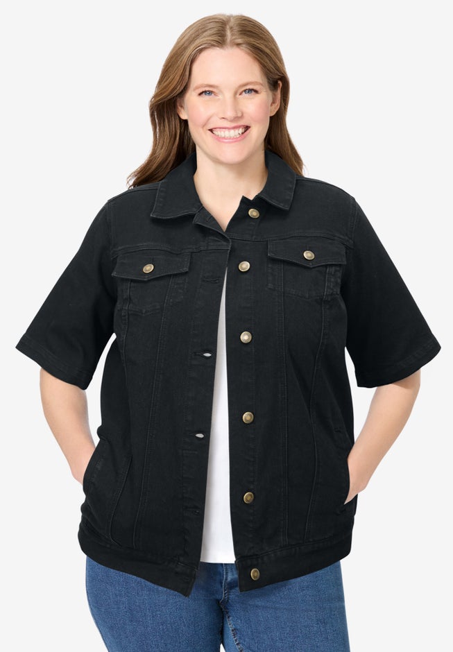Your favorite jacket is here! Perfect to throw on in warm weather. Relaxed fit denim jacket with short sleeves. Also available in Twill. 28” length.