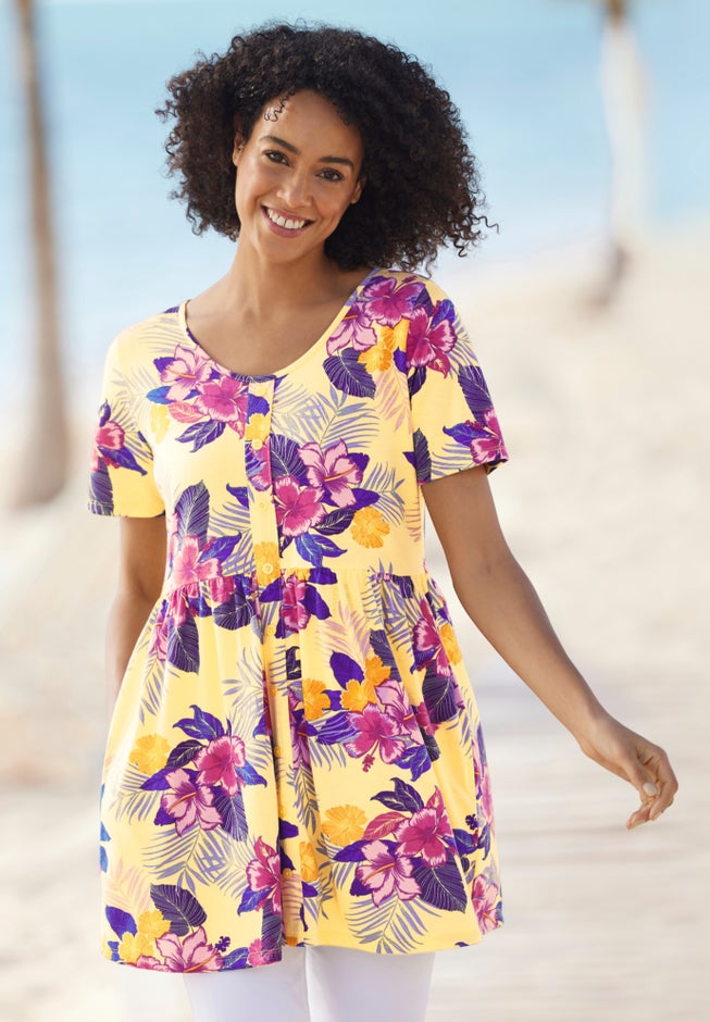 • Feel fabulous in this relaxed-fit short-sleeve tunic with a stylish empire waist.