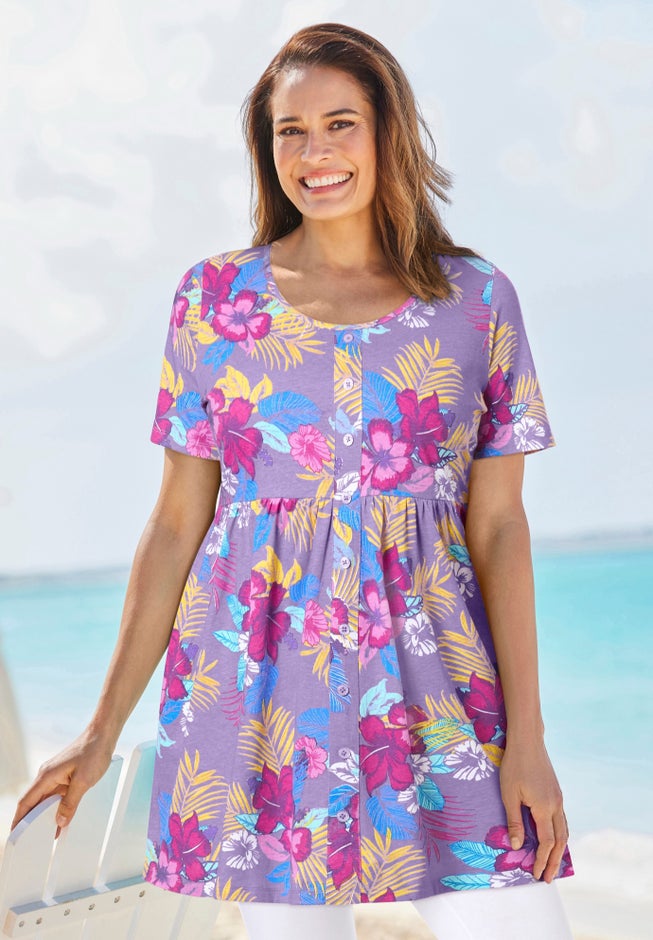 • Feel fabulous in this relaxed-fit short-sleeve tunic with a stylish empire waist.