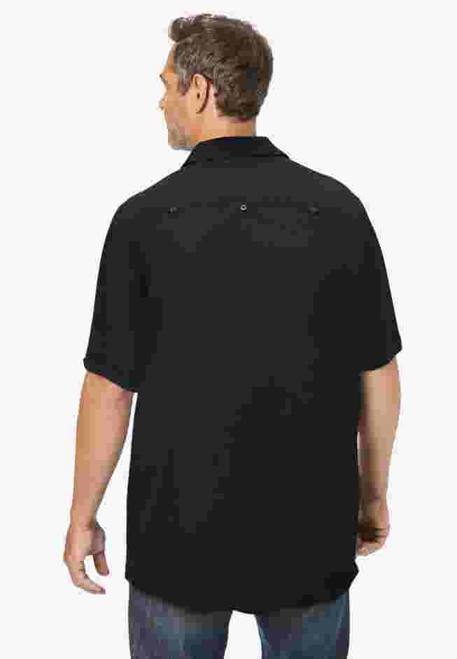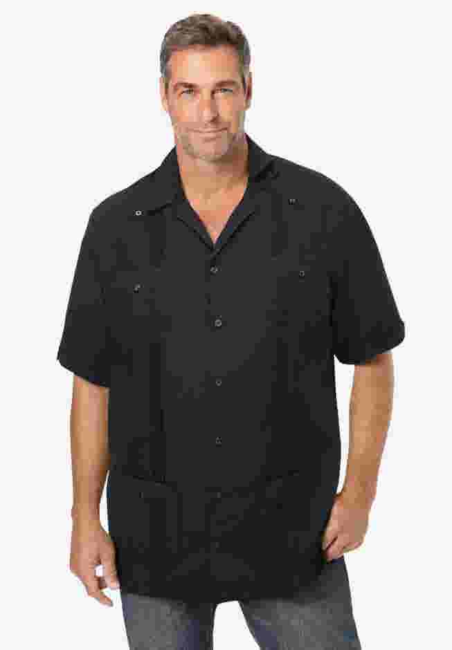 Our Short-Sleeve Guayabera Shirt is a warm weather style at its best. It has a looser fit and is made from a breezy woven cotton blend. Embroidered stitching makes it an eye-catching wardrobe standout.