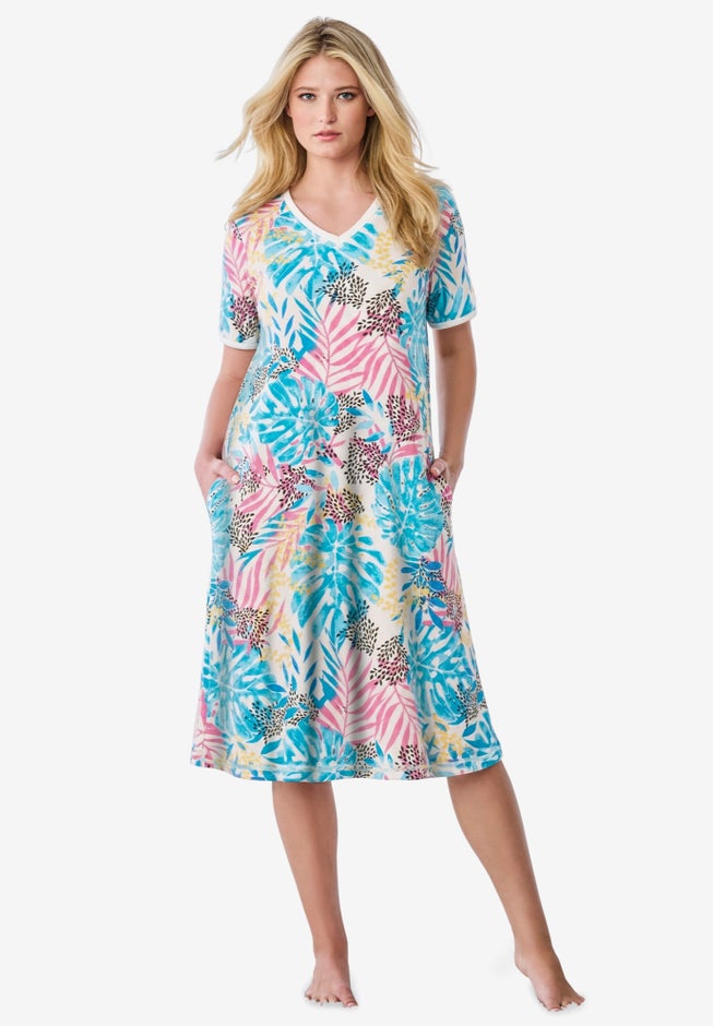 • Enjoy ultimate comfort with this delightful lounge dress featuring short sleeves and V-neck.