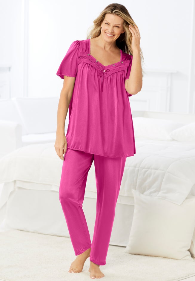 Sweet and feminine, this pajama set features a pretty flutter sleeve top with delicate shirring above the bust and tiny rosette accents for lovely detail. Paired with matching elastic-waist pants, this gorgeous set is supremely silky and feels amazing when lounging or sleeping.