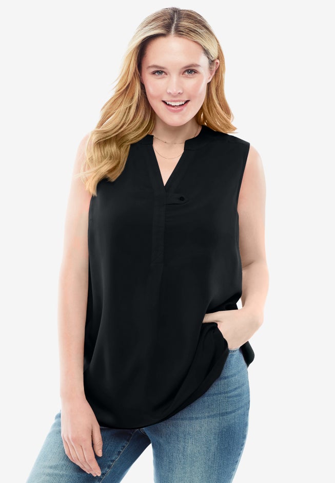 We've updated your favorite tab-front tunic in a sleeveless, easy-layering style. Mandarin neckline combines with a functional button tab and shirttail hem, making this a warm-weather must-have.