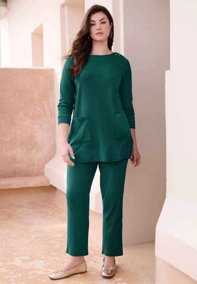 This laid-back boatneck tunic features long sleeves with cuffs, practical front pockets, and a straight hem with side slits and snap closures. It’s a perfect everyday look that is both comfortable and stylish for the season.