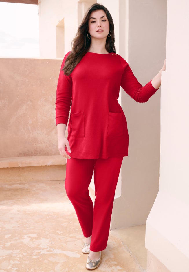 This laid-back boatneck tunic features long sleeves with cuffs, practical front pockets, and a straight hem with side slits and snap closures. It’s a perfect everyday look that is both comfortable and stylish for the season.