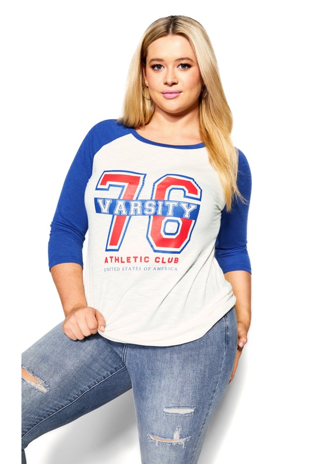 Stand out in style with the relaxed fit of the Societie Graphic Top. This baseball tee has something to say with its bold graphic style, contrast sleeves and soft stretch fabrication.Key Features Include: - Round neckline - Contrast 3/4 length sleeve- Relaxed fit - Graphic print to front - Hip length hemline Paired with denim shorts and sandals, this top is a must-have for any time of year.