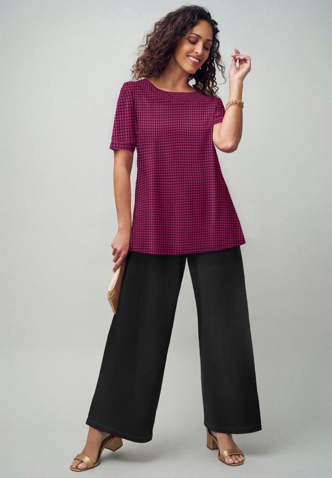 Our classic swing tunic meets our popular stretch knit fabric. The stretch jersey knit drapes beautifully, keeps its smooth shape wash after wash, and packs without wrinkling. This flattering boat neckline and a stylish length will eases over all of your favorite bottoms.