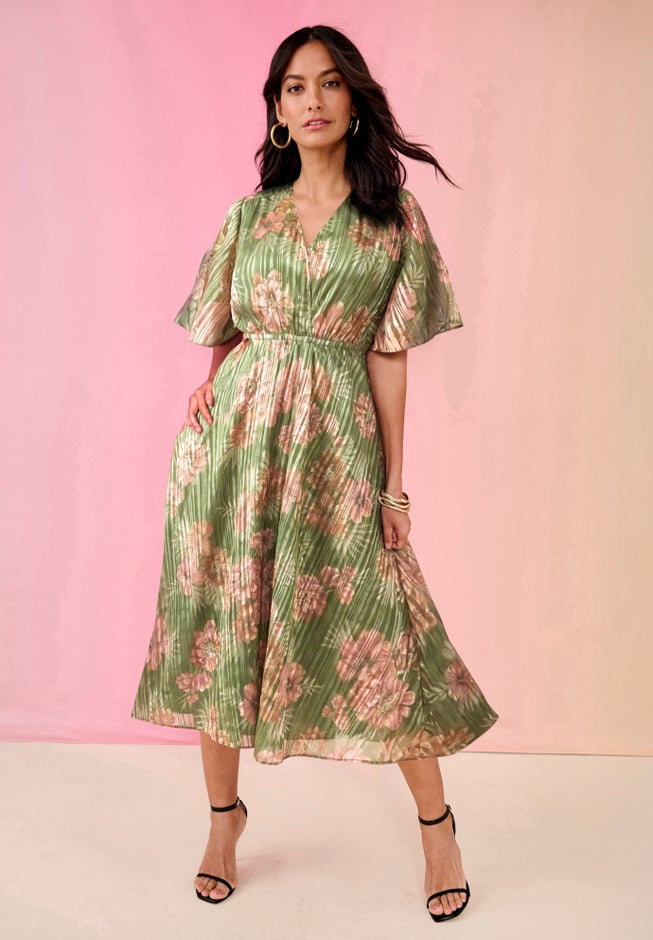 This flutter sleeve V-neck maxi dress features a flattering empire waist and crinkled lurex fabric with subtle variegated stripes. It combines elegance with effortless style, perfect for any formal or casual occasion.