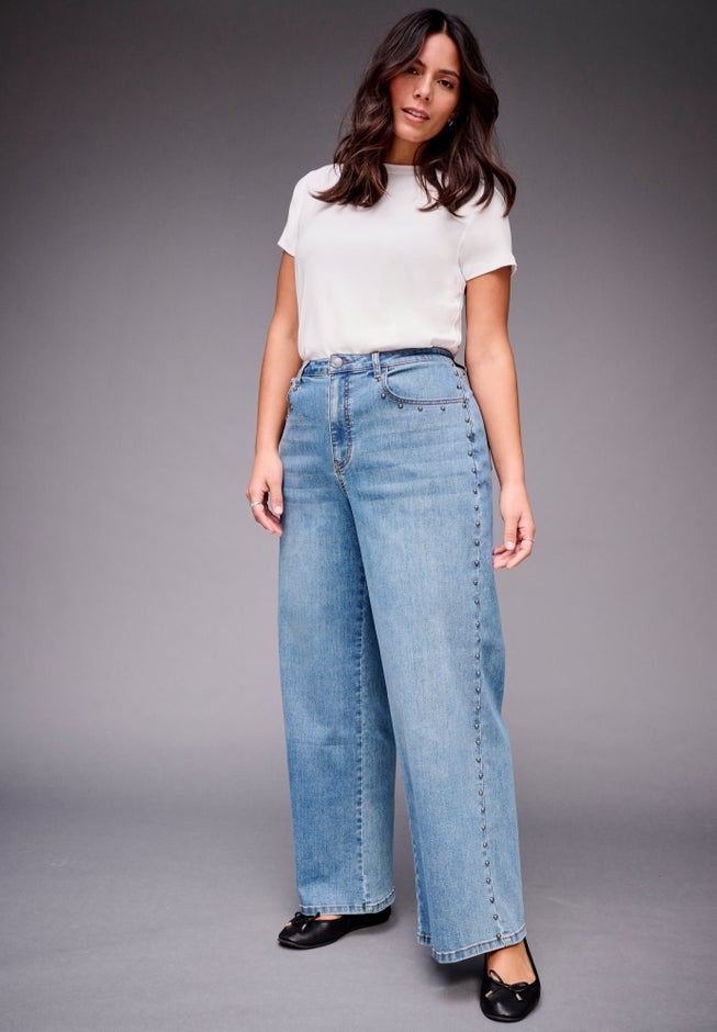 A modern take on a classic silhouette, these wide-leg jeans feature subtle stud trim along the seams for a touch of edge. The high-rise fit flatters the waist while the relaxed leg creates effortless movement. Perfect for elevating everyday style with understated detail.
