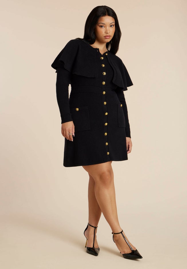 For whenever your go-to sweater dress is feeling lackluster, this mini sweater dress comes finished with a chic cape overlay, non-functional gold button placket, and easy-wearing comfort.