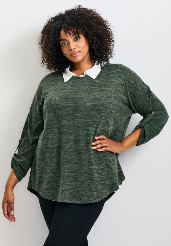• Woven underlay shirt with cozy hacci long sleeve overlay