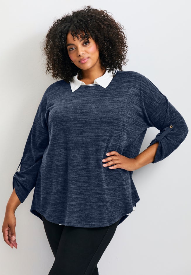 Discover the ultimate style hack with the Tara 2Fer top – a chic fusion of elegance and versatility! Effortlessly switch up your look with two garments in one; a breezy cotton voile underlayer shirt paired with a trendy Hacci 3/4 sleeve overlay. Featuring button tab sleeves and a contrast neck band, this top is your new go-to for effortless sophistication!