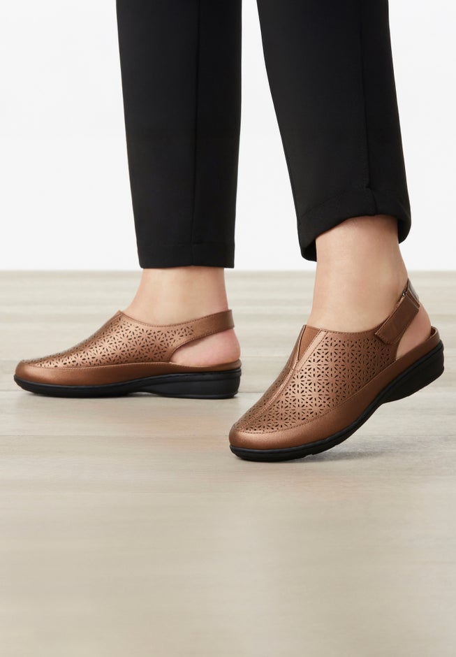 A must-have for your work-to-weekend closet! These versatile slings feature a faux leather upper with pretty details and adjustable, self-adhesive strap.
