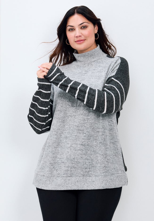 Meet the Theresa Splice Top – where comfort meets style! With its cozy brushed hacci fabric and playful color-blocked design, this turtle neck top is perfect for those relaxed weekends. Slip into long sleeve coziness and make a bold statement with stripe sleeves – your new go-to for effortlessly chic vibes!