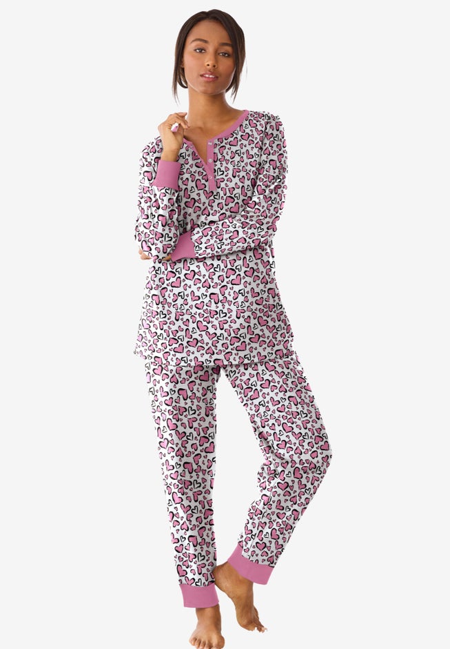 This thermal knit pajama set is where cute meets cozy. The set consists of a long-sleeved henley shirt and coordinating pajama pants. It has a relaxed fit and is perfect for cooler days.