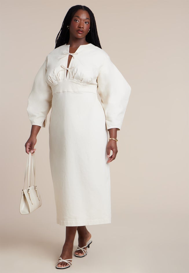 Bring effortless romance to your lineup with this tie front denim maxi dress. A keyhole neckline and soft stretch denim create fluid movement with modern ease.