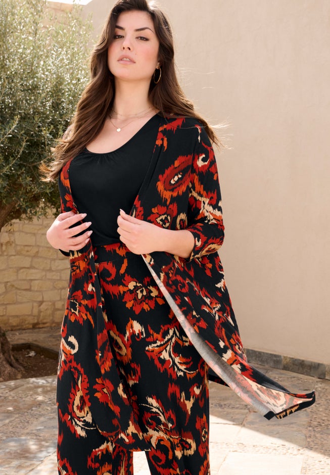 Featuring an open-front design, this flyaway cardigan is an ideal layering piece to always have on hand. Its extra length provides plenty of coverage over a tank or tee, making it great for your air-conditioned office or to use between seasons. Three-quarter sleeves.