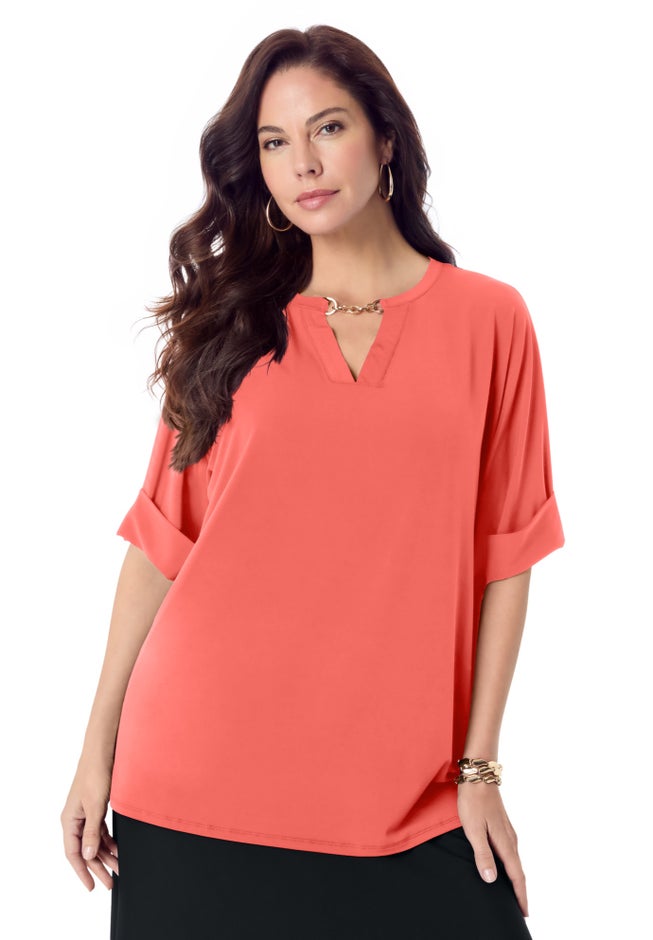 Your average casual tee just got an upgrade. This notched V-neck tee features a gold chain detail at the neckline for a stunning contrast. With a flattering straight silhouette, this tee has elbow-length dolman sleeves for a relaxed look.
