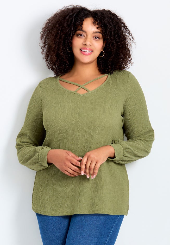 This long-sleeve top features a textured fabric and a stylish V-neckline with crisscross strap detailing. The gathered cuffs lend a subtle touch of volume to the sleeves, creating a polished yet playful look.