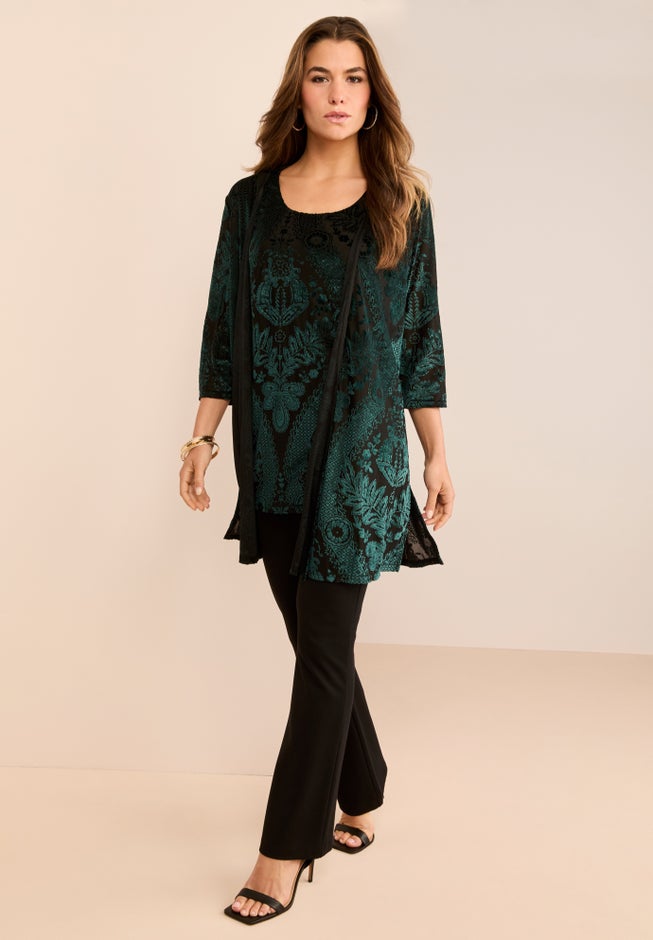 Add rich texture to your look with this burnout velvet cardigan and tank top twinset. A relaxed open-front silhouette with elbow-length sleeves layers over a scoop neck tank. Lightweight and drapey, it’s the perfect layer to elevate both everyday and evening outfits.