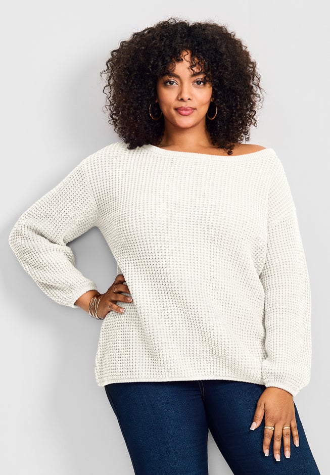 Turn up the cozy charm in this relaxed sweater, designed to be worn on or off the shoulder for versatile styling. The chunky waffle knit texture adds dimension while keeping things soft and comfortable. Perfect for dressing up or down, this versatile style brings an effortlessly cool vibe to your casual wardrobe.