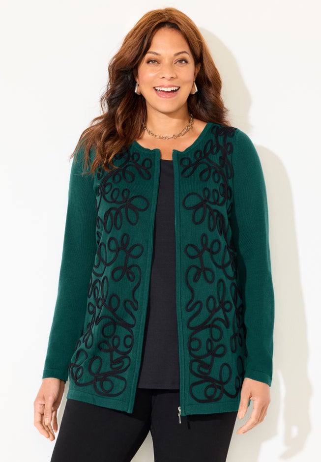 Our zip-front cardigan is a layering favorite you can’t help but love. Beautiful embroidered detail on the front adds an elegant touch and stylish texture that elevates the cardigan to a wardrobe piece worthy of dinner party status. Pair with our Refined Fit Pant for a beautiful, polished look.