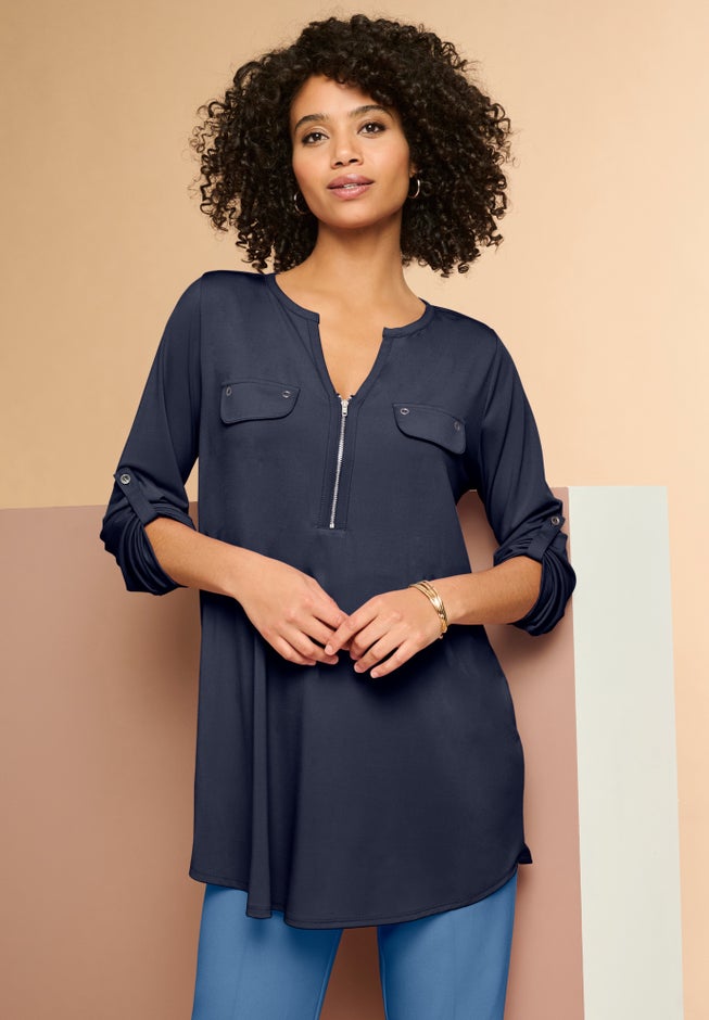 This versatile tunic combines casual chic with utility, featuring a sleek metal zipper front and stylish roll-tab sleeves. The A-line silhouette with a curved hem offers a flattering fit, while the non-functional chest pocket flaps and silver hardware add a touch of modern edge.