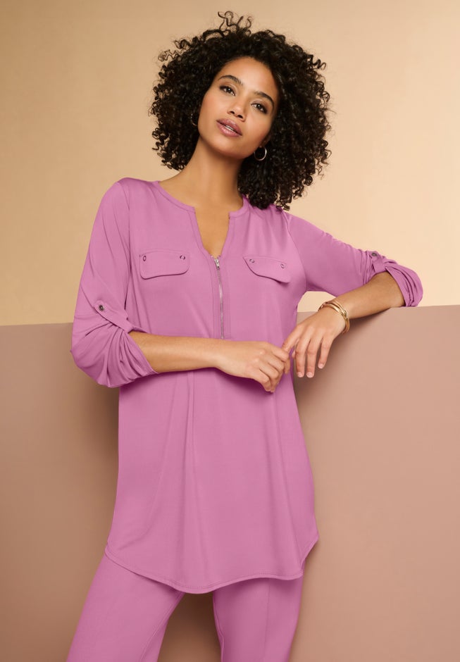 This versatile tunic combines casual chic with utility, featuring a sleek metal zipper front and stylish roll-tab sleeves. The A-line silhouette with a curved hem offers a flattering fit, while the non-functional chest pocket flaps and silver hardware add a touch of modern edge.
